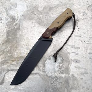 - Blade: fixed (full tang), drop point profile with flat grind, plain cutting edge
