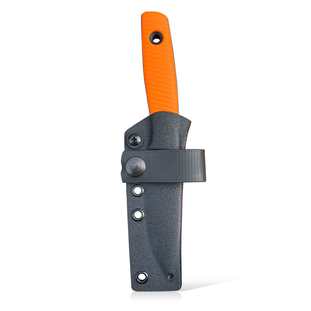 Knife comes with holster made of hand-formed black Kydex material, which we attach to the belt with a grommet made of durable belt. The handle made of this material gives flexibility, which, for example, when squatting or bending, is arranged in a way that limits the occasional burdensome squeezes or body cuts. To facilitate the removal of the knife, which fits very well in the tight-fitting material, a thumb support has been planned, thanks to which the knife can be removed in a controlled and safe manner. Kydex itself is a very durable material that is characterized by high resistance to impacts, scratches, low moisture absorption, resistance to various weather conditions and many chemicals. We use holsters made of it comfortably and for a long time. The holster is equipped with pass-through pins to which you can attach, for example, a flint holder (not included in the set) or use them to attach it to a backpack, harness element or Molle type solution.