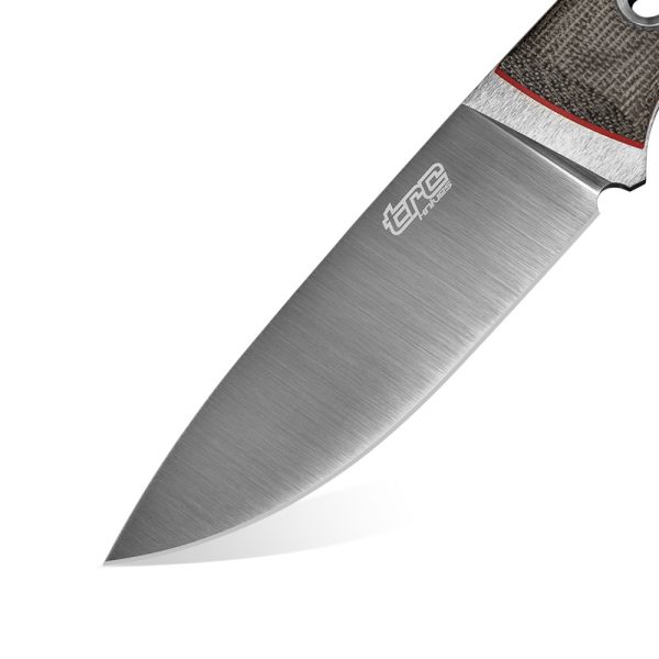 The handle linings with an ergonomic, oval shape are made of black Micarta. Micarta is a material resistant to moisture, temperature changes, most solvents and acids, with high resistance to mechanical damage. Micarta, known for its excellent properties, also visual (can be stylized as a natural material) has a non-slip, rough structure. The facings themselves were glued and mounted with tubes consistent with the overall design of the knife. The entire precisely designed structure makes the handle fit the hand very well and the grip is strong and secure. At the end of the handle, there is a hole for attaching an additional cord, which can be used as protection against dropping the knife during operation.