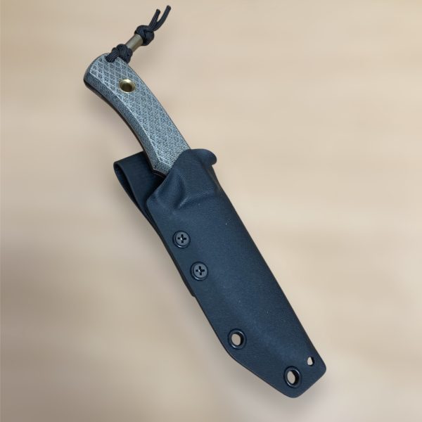 The handle scales feature an ergonomic, oval shape and are made from black Canvas Micarta, a material known for its resistance to moisture, temperature changes, most solvents and acids, and its high durability against mechanical damage. Micarta, prized for both its performance and appearance (it can be styled to resemble natural materials), has a non-slip, textured surface. The scales are glued and mounted with brass tubes that match the overall design of the knife. This thoughtful construction ensures the handle fits well in the hand, providing a strong and secure grip.