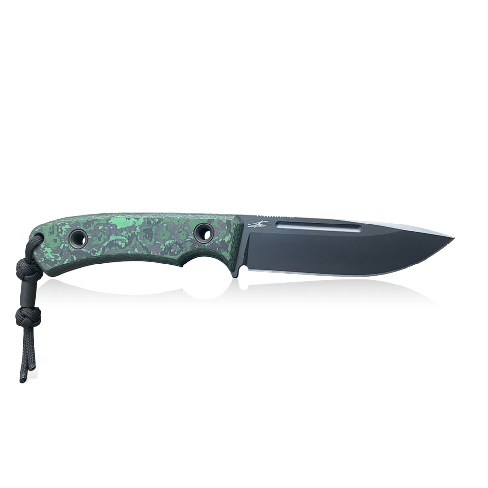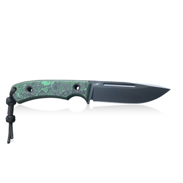 Limited edition of K-1s knife. Series is planned for 150 pieces only. The blade made of Elmax steel coated with DLC (hardness approx. 90 HRC) is additionally distinguished by a fuller on both sides of the blade and a swedge on the blade. Handle scales are made from beautiful variety of carbon fiber (fat carbon) in green and black colors (“Jungle Wear”).
