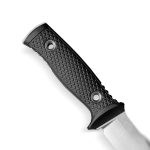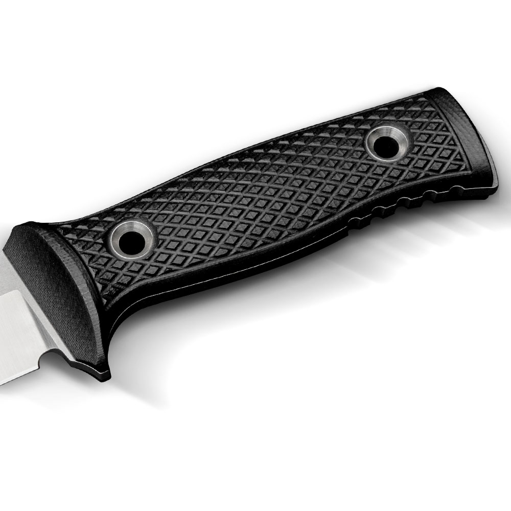 The handle linings with an ergonomic, oval shape are made of G10, resistant to moisture, temperature changes, most solvents and acids, with high resistance to mechanical damage. G10 has a non-slip, milled structure. In the linings there are through-pins, which on the one hand are used to attach them (except for gluing) and on the other they are used to attach an additional cord, which can be used as protection against dropping the knife during work, or an additional gripper to facilitate removing the knife from the holster.
