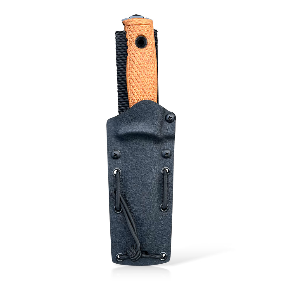 The knife has a holster made of hand-molded Kydex material, characterized by high impact and scratch resistance, low moisture absorption, resistant to various weather conditions and many chemicals. To facilitate the removal of the knife, which fits very well in the tight-fitting material, a thumb support has been planned, thanks to which the knife can be removed in a controlled and safe manner. The holster can be attached to the belt – using a grommet made of durable nylon with a heavy weight. The holster has a cord for alternative forms of carrying on parts of the harness, back, parts of the MOLLE system, etc. The cord stretches like rubber and does not lose its elasticity (does not damage, does not break) even in extreme (negative and positive) weather conditions.