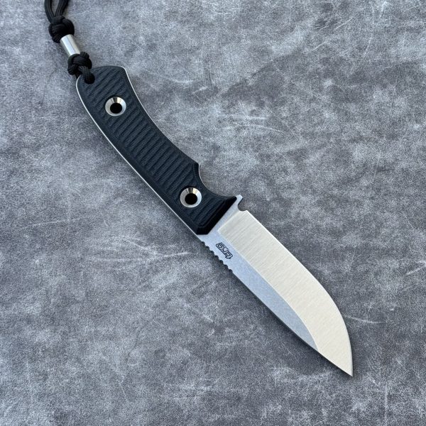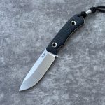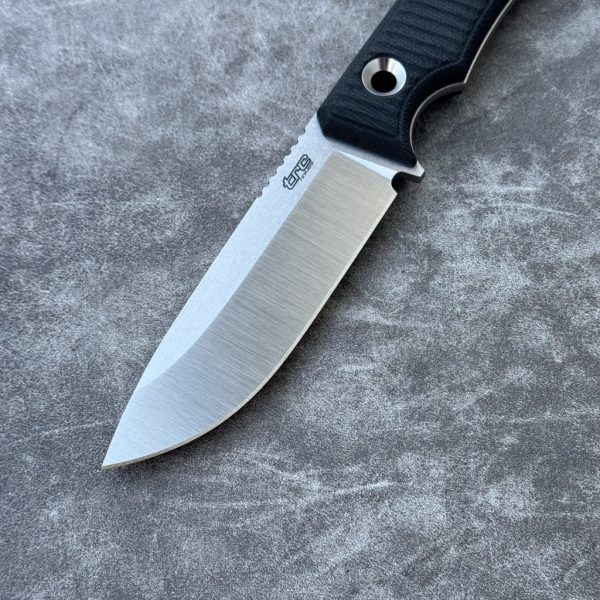 The blade with a spine thickness of 3.5 mm (0.12″) made in the drop point style will meet most tasks that can be encountered while in the field. Work in wood or more subtle tasks, such as preparing a meal, are natural tasks for this knife. The blade is made with a flat grind, supports the process of smooth cutting and performing various tasks. There is jimping on the spine, which is a support for the thumb during cuts that require the use of greater force. The knife has a guard, which together with the undercut for the finger in the handle prevents the hand from slipping onto the cutting edge during work. The rounded ridge protruding from the handle improves comfort and grip.