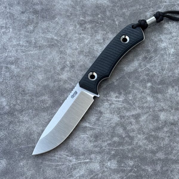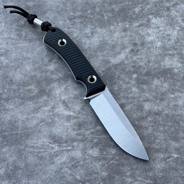 - Blade: Fixed (full tang), drop point profile with flat grind, plain cutting edge