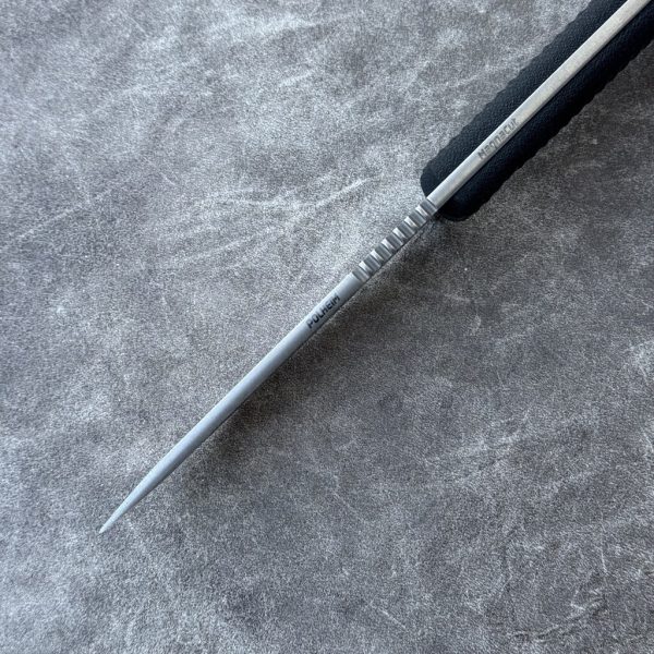 The handle linings with an ergonomic, oval shape are made of Micarta. Micarta is a material resistant to moisture, temperature changes, most solvents and acids, with high resistance to mechanical damage. Micarta, known for its excellent properties, also visual (can be stylized as a natural material) has a non-slip, rough structure. The facings themselves were glued and mounted with tubes consistent with the overall design of the knife (sianless steel rivets). The entire precisely designed structure makes the handle fit the hand very well and the grip is strong and secure. At the end of the handle, there is a hole for attaching an additional cord, which can be used as protection against dropping the knife during operation. Originally, a decoration in the form of a stainless steel bead was pinned to the hole.