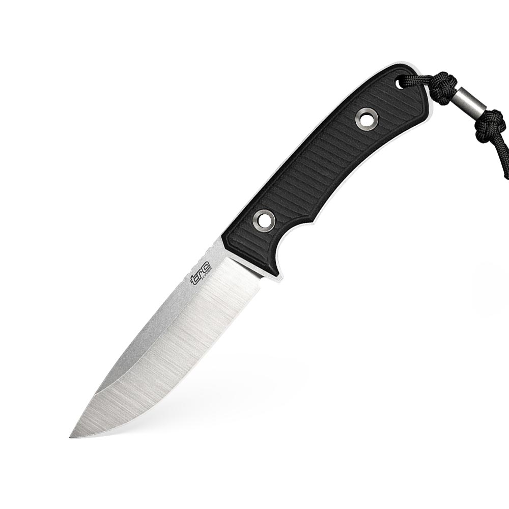 - Blade: Fixed (full tang), drop point profile with flat grind, plain edge