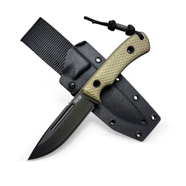 Knife comes with holster made of hand-formed black Kydex material, which we attach to the belt with a grommet made of durable, heavyweight nylon. The handle made of this material gives flexibility, which, for example, when squatting or bending, is arranged in a way that limits the occasional burdensome squeezes or body cuts. To facilitate the removal of the knife, which fits very well in the tight-fitting material, a thumb support has been planned, thanks to which the knife can be removed in a controlled and safe manner. Kydex itself is a very durable material that is characterized by high resistance to impacts, scratches, low moisture absorption, resistance to various weather conditions and many chemicals. We use holsters made of it comfortably and for a long time. The holster is equipped with pass-through pins to which you can attach, for example, a flint holder (not included in the set) or use them to attach it to a backpack, harness element or Molle type solution