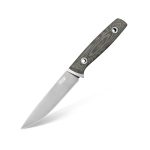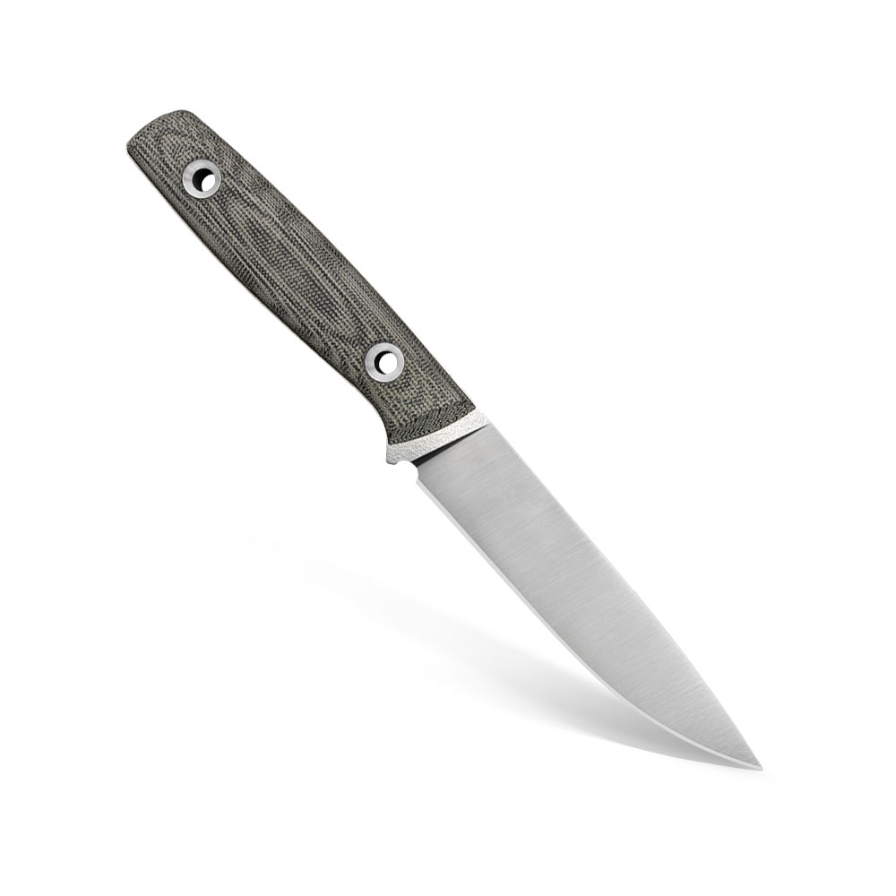 With a longer blade than the previous edition, 130 mm long (previously 118 mm), it is even better for processing meat and fish and preparing food. The stylish satin blade made of European premium M390 steel elegantly matches the handle made of classic Micarta in shades of ash and black (Black Canvas Micarta). The whole is complemented by a comfortable and durable black Kydex sheath.