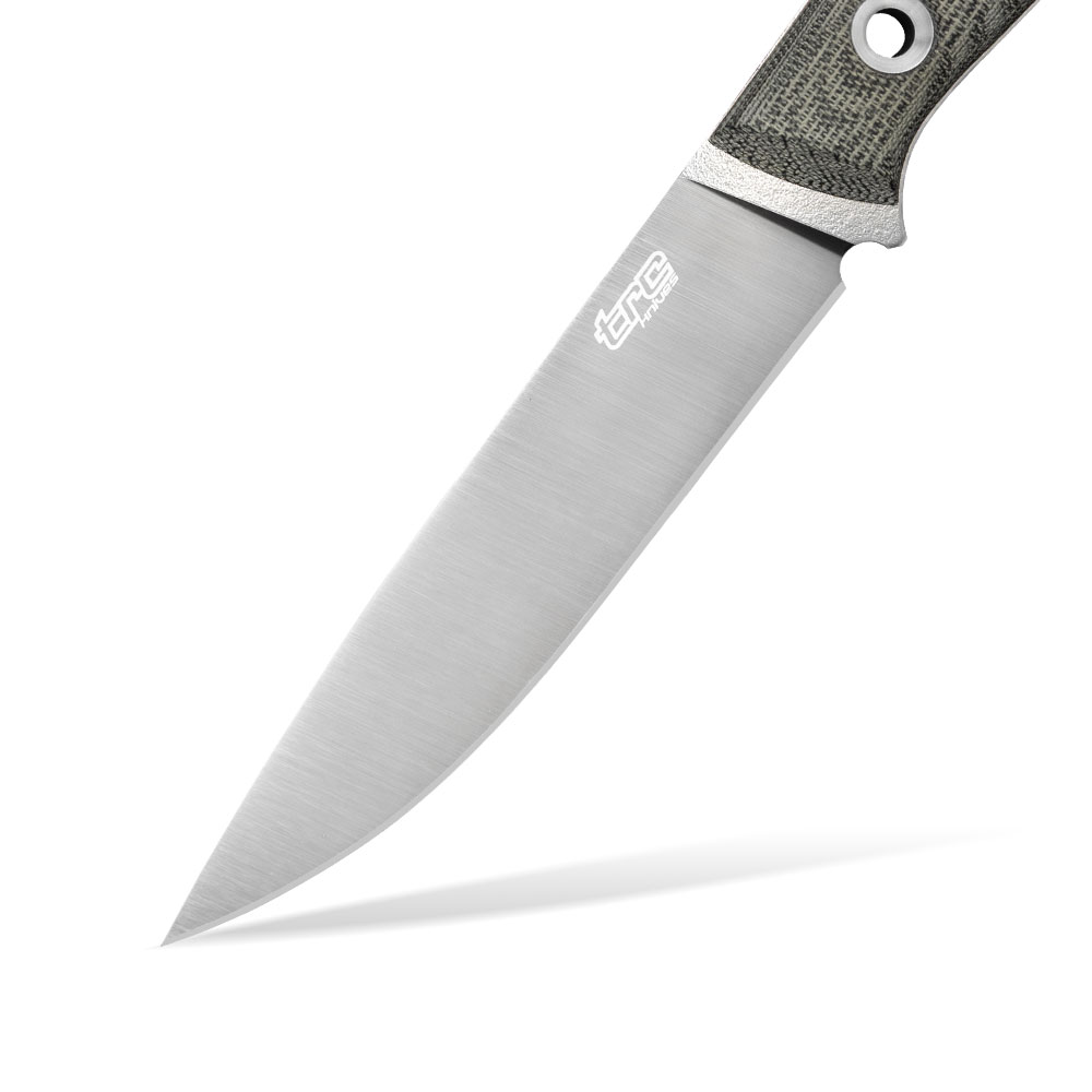 - Blade: fixed (full tang), drop point profile with full flat grind (FFG), plain cutting edge