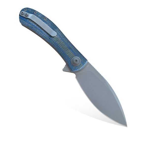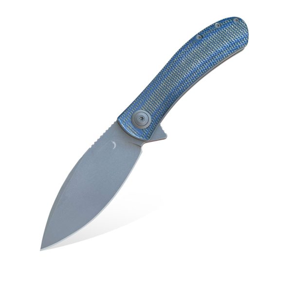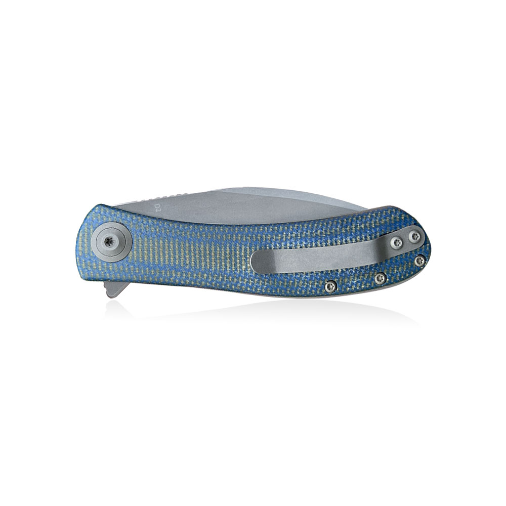 - Handle: stainless steel liners and backspacer, handle scales in blue-grey micarta with distressed jeans effect, stainless steel (Tip-Up)