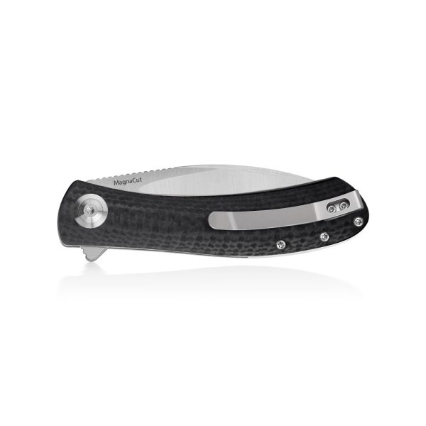 - Steel: MagnaCut (63–64 HRC), satin finish