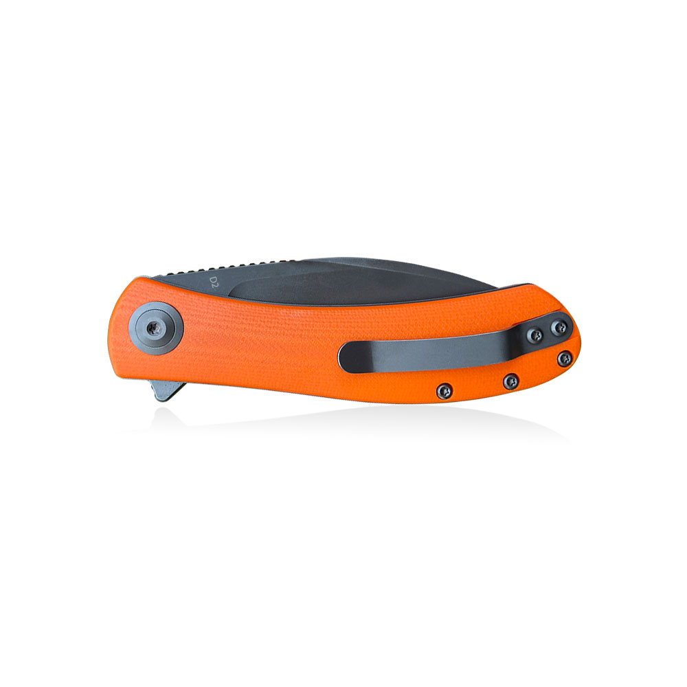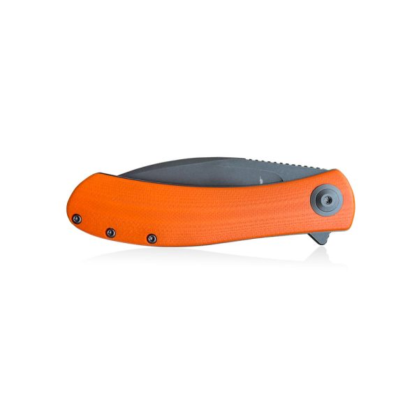 - Handle: stainless steel liners and backspacer, orange G10 scales, stainless steel (Tip-Up)