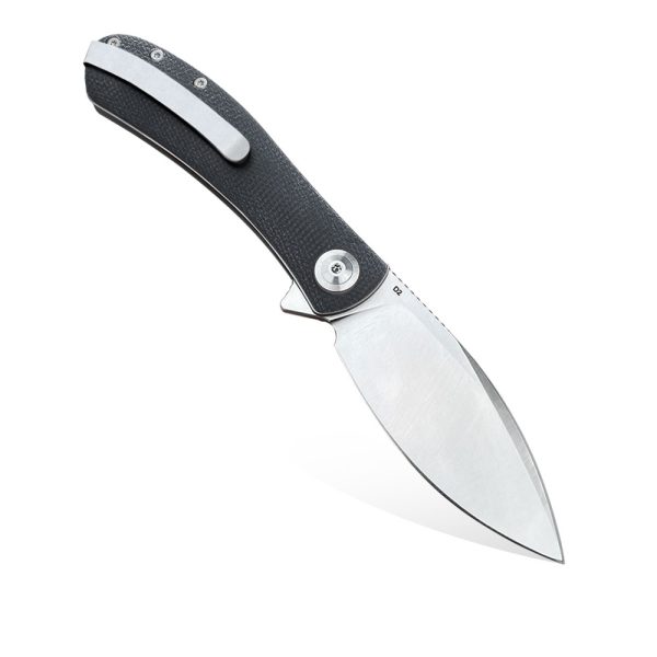 - Blade: Folding knife with drop point blade, flat grind, plain cutting edge