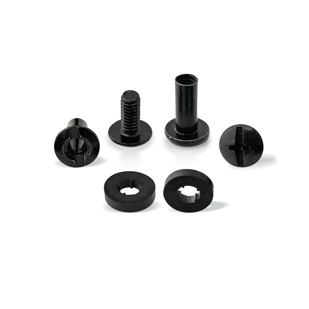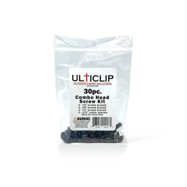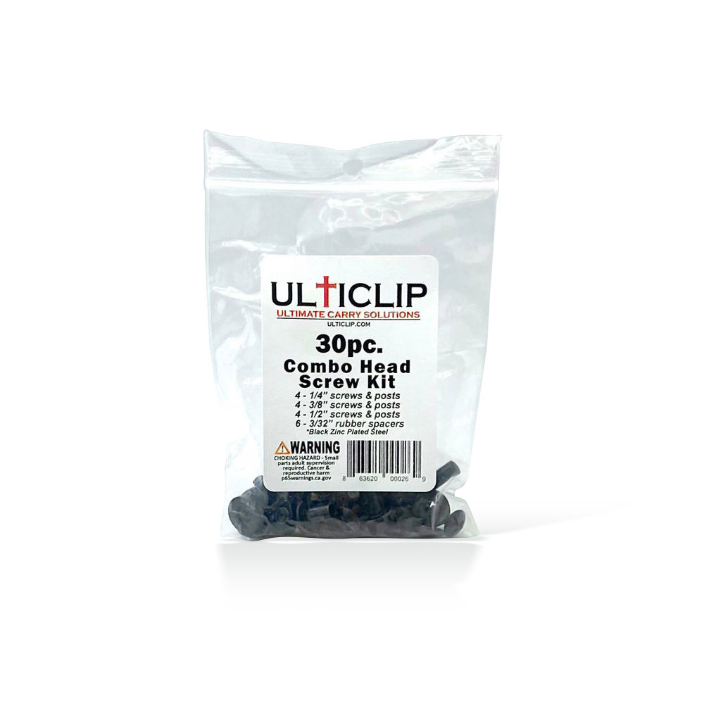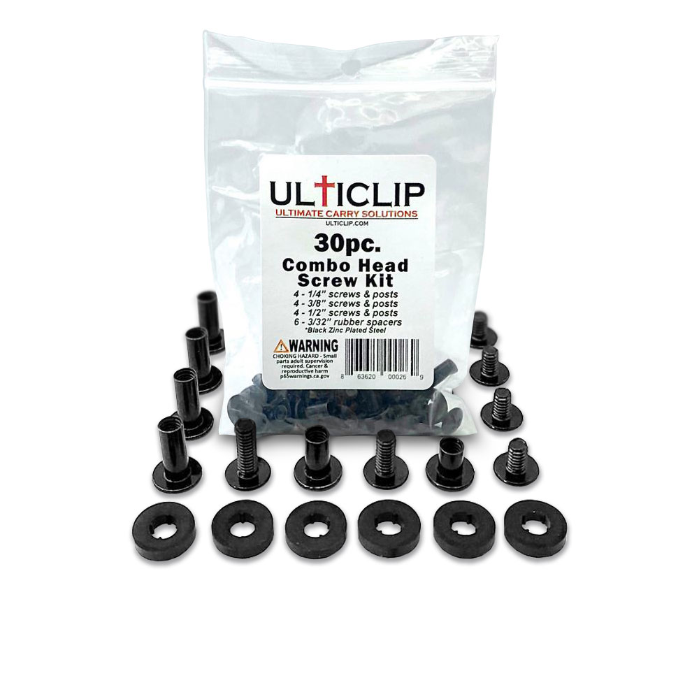 Ulticlip Combo 30 pc Head Screw Kit is a set that allows you to mount Ulticlip products and other accessories to a wide variety of sheaths, holsters, and other items. The black zinc plating provides great rust resistance. With our combination of screws, posts, and spacers, you can custom mount hardware on items up to ¾” thick.