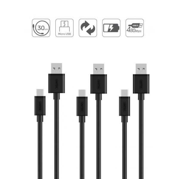 Unitek Cable Set microUSB-USB 0,3m x 3allows you to charge devices equipped with a microUSB port and data transfer rate at 0.48 Gbps.