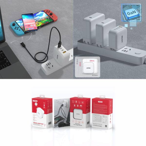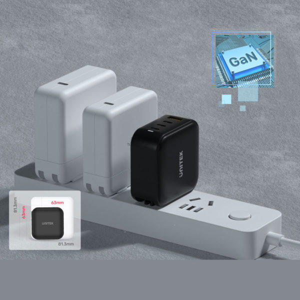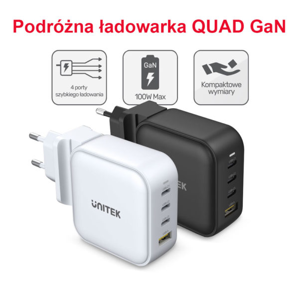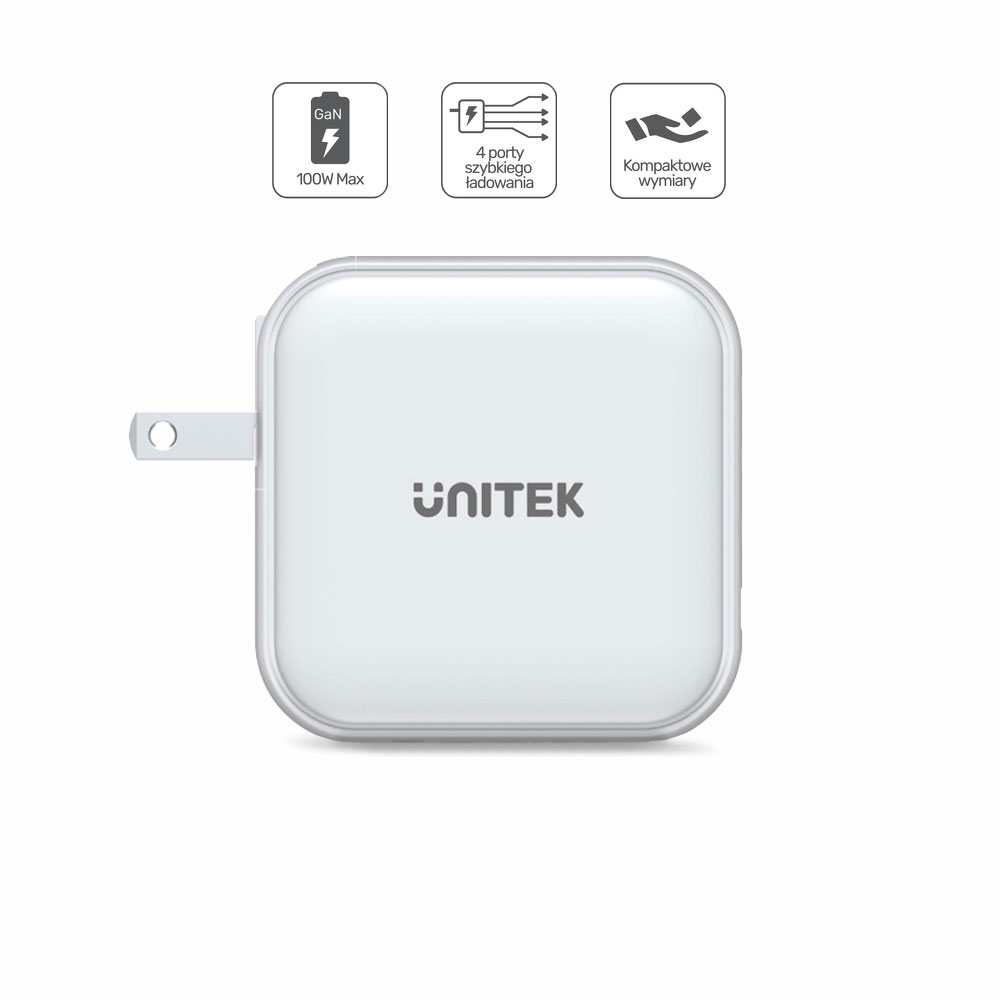 Unitek Charger GaN 4 ports PD 100W QC 3.0 White is a universal and compact travel charger. American, European, British and Australian plugs included. Output ports are 3 x USB-C and 1 x USB-A.