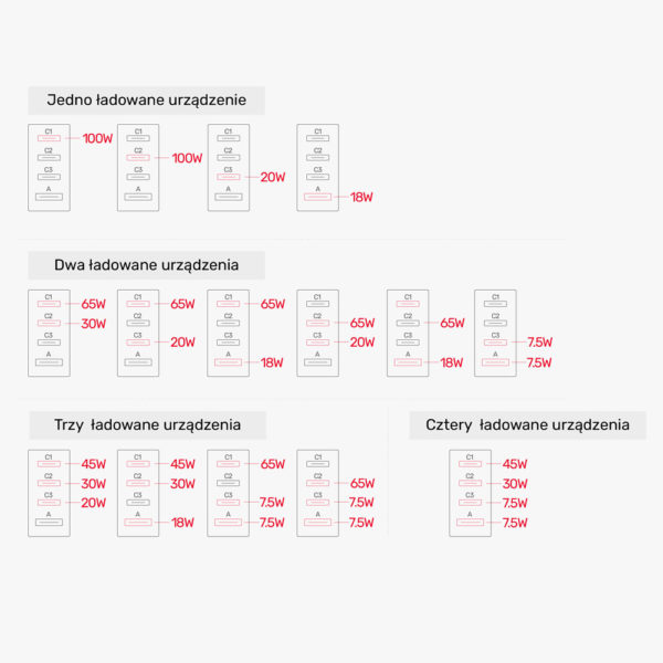 Ładowarka Unitek GaN 4 porty PD 100W QC 3.0 Biała allows simultaneous charging on all four ports. USB-C ports 1 and 2 support up to 100W, and port 3 supports up to 20W. USB-A port supports Quick Charge 3.0 up to 18W and is backward compatible. When devices are connected to all three USB-C ports, the maximum output power on the first port is 45W, the second port is 30W, and the third port is 20W. Charging via one USB-C port and one USB-A gives a maximum of 65W on the former and 18W on the latter. When charging four devices at once, the first USB Type-C port offers a maximum of 45W, the second USB-C port offers 30W, and the third USB-C and USB-A ports offer 7.5W each. The total output power of the charger is 100 W, achievable when charging one device from the USB-C 1 or USB-C 2 ports.