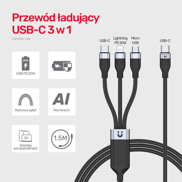 Unitek USB–C Charging Cable 3 in 1 Black allows you to charge three devices at once. You can connect any phone available on the market, because it has three different connectors: USB-C, Micro-USB, and Lightning. It works well as a charging cable in the car in a situation where we do not know what phone the passenger will have. Great for businesses such as hotels or taxis, where there are many customers who may need a charger. Fits USB-C chargers.