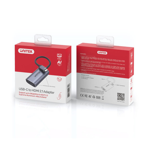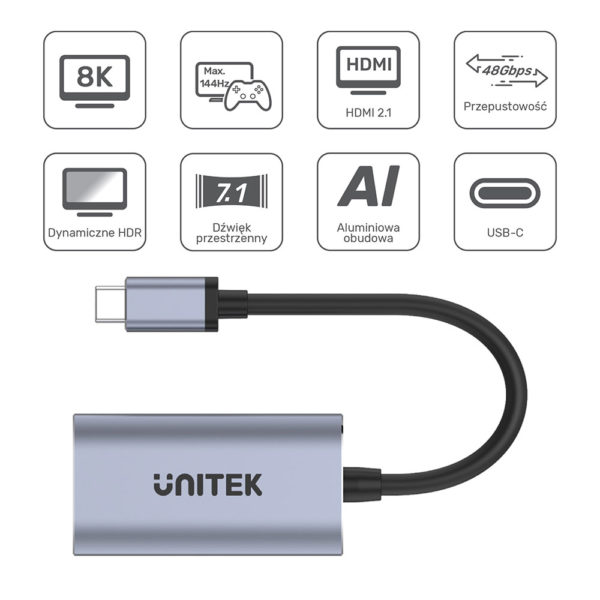 Adapter Unitek USB-C na HDMI 2.1 8K has a USB-C connector and HDMI port and supports 8K video resolution.