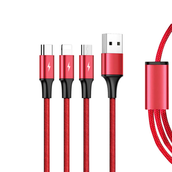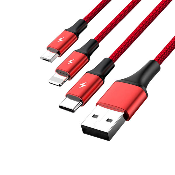 Unitek USB Charging Cable 3 in 1 Red has a standard USB input and three outputs for USB-C, microUSB and Lightning that can be used at the same time.