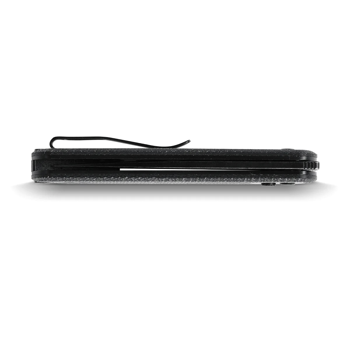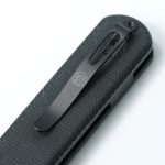 - Rękojeść: okładki z micarty (black | czarna) osadzone na stalowym korpusie (linersy), backspacer z micarty (black | czarna), klips do przenoszenia ze stali nierdzewnej (Tip-Up, reversible | obustronny), wstawki z tytanu