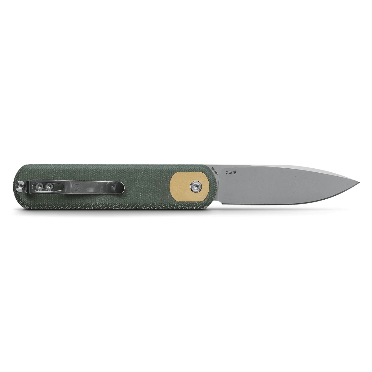 Corgi to mały nóż składany z ostrzem o profilu drop point z ostrzem fałszywym poprawiającym właściwości penetrujące całości. Corgi to subtelny folder, który po złożeniu prezentuje się równie symetrycznie jak i przed. Folder wyróżnia możliwość otwarcia górną płetwą i dolną płetwą jako front flipper i back flipper lub za sprawę blokady Trek Lock.