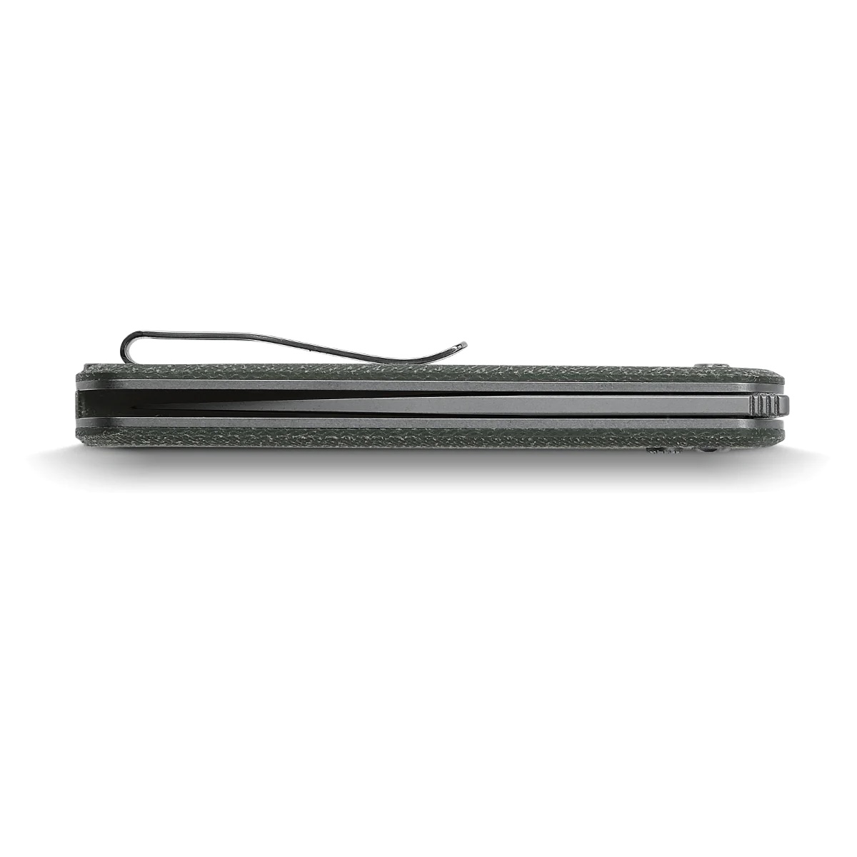 - Rękojeść: okładki z micarty (green| zielona) osadzone na stalowym korpusie (linersy), backspacer z micarty (green | zielona), klips do przenoszenia ze stali nierdzewnej (Tip-Up, reversible | obustronny), wstawki z mosiądzu (brass)