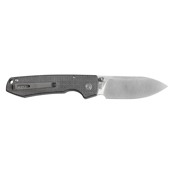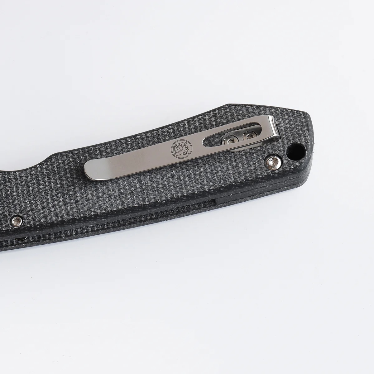 - Rękojeść: okładki z micarty (black | czarna) osadzone na stalowym korpusie (linersy), backspacer z micarty (black | czarna), klips do przenoszenia ze stali nierdzewnej (Tip-Up, reversible | obustronny)