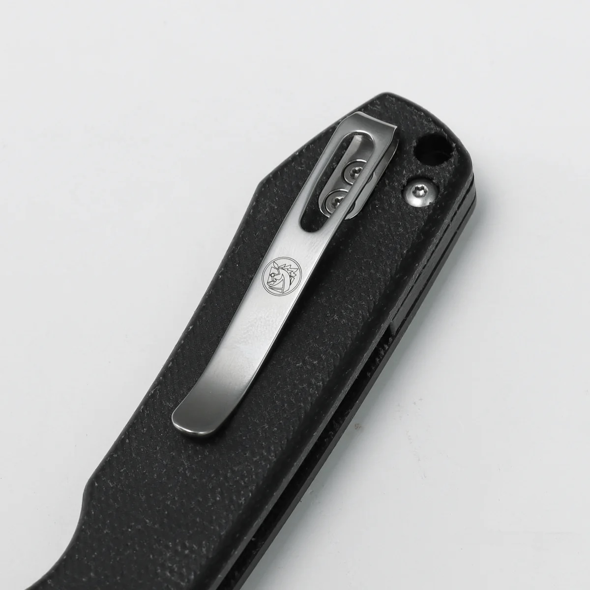 - Rękojeść: okładki z micarty (black | czarna) osadzone na stalowym korpusie (linersy), backspacer z micarty (black | czarna), klips do przenoszenia ze stali nierdzewnej (Tip-Up, reversible | obustronny)