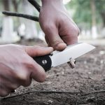 - Ostrze: składane (folding knife), sheepsfoot ze szlifem płaskim, gładka krawędź tnąca