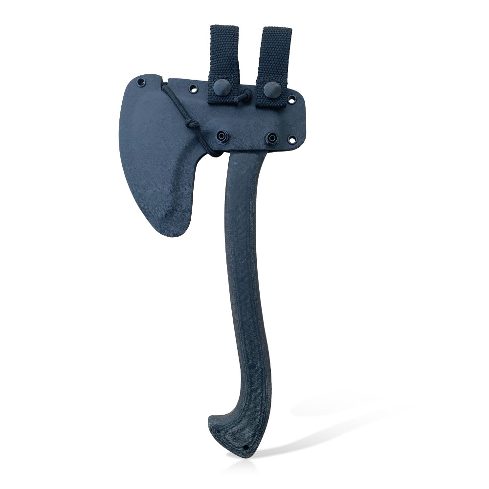 The perfect companion for backcountry adventures or your bugout bag. Compact, lightweight, and versatile. Hold at the base of the handle for chopping, choke up behind the blade for finer tasks. 80CrV2 steel, with full tang construction, makes for an exceedingly tough and reliable tool that is also easy to sharpen in the field. This run features black canvas micarta scales and a kydex quick access sheath. Made by Master Bladesmith Daniel Winkler and his team in the mountains of North Carolina.