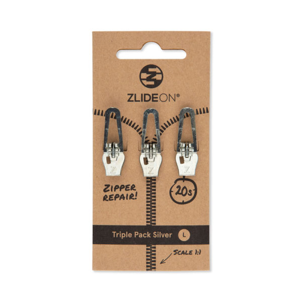 ZlideON L Triple Pack Silver Zipper Repair is a quick repair of your jacket, backpack, shoes or bag literally in 30 seconds. It is designed for plastic, metal and narrow zippers in size L. Additional information on choosing the right slider can be found in the description below.