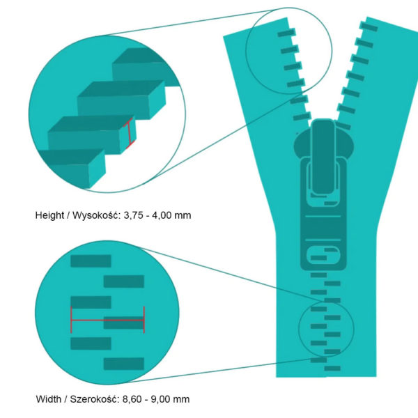 • For: standard plastic and metal zippers in size XXL (8,6-9,0 mm / 3,75-4,0 mm)